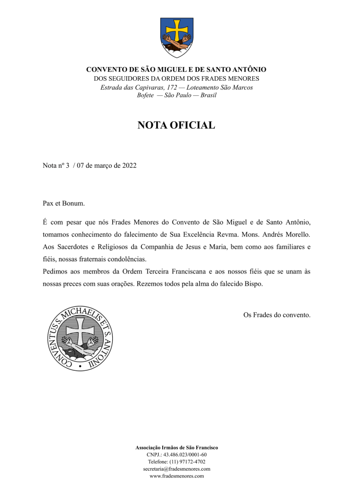 NOTA OFICIAL: Falecimento de S. E. R. Mons. Andrés Morello