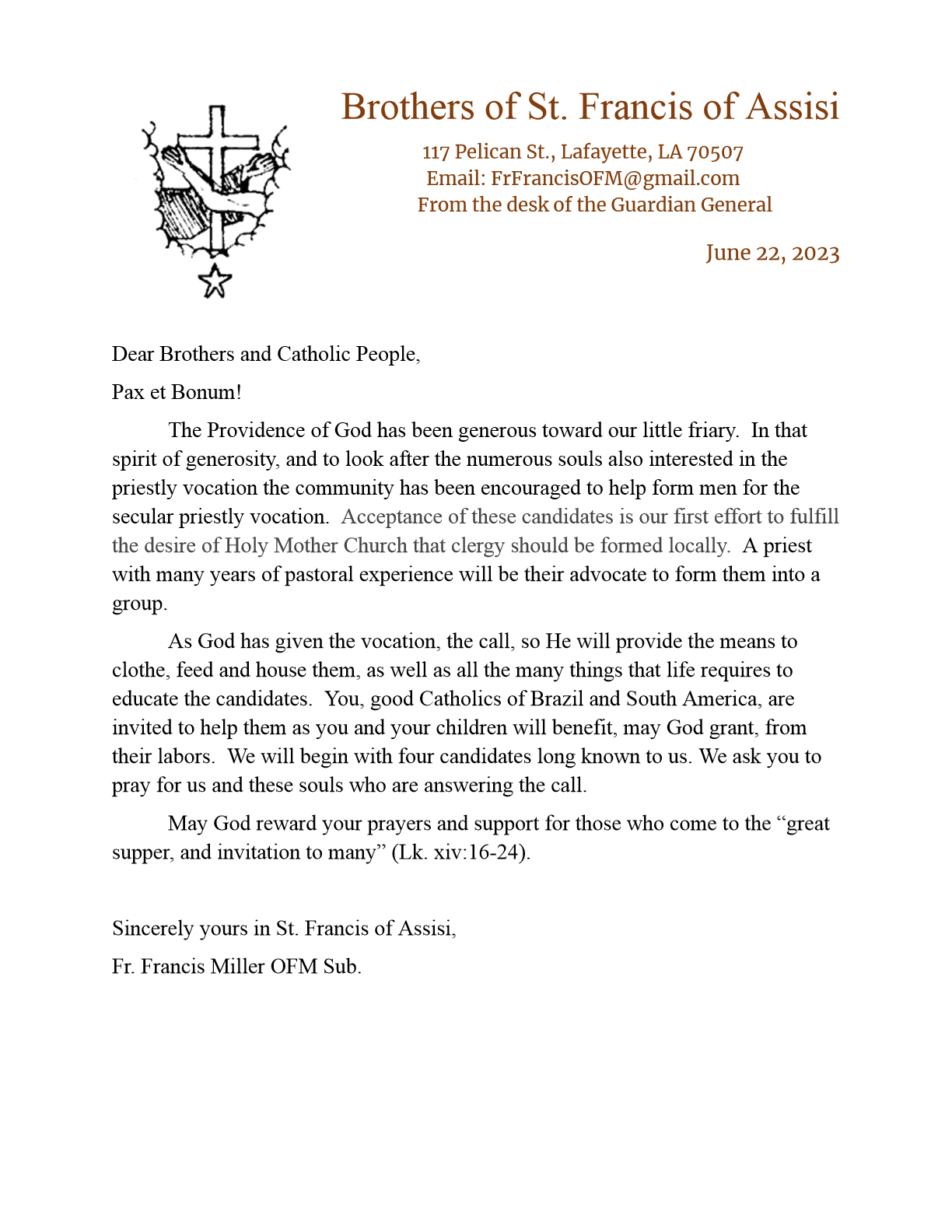 Pax et Bonum! É com alegria que anunciamos a fundação do Seminário Secular, para a formação dos Sacerdotes Seculares em nosso país. Segue-se a Carta do Rev. Pe. Frei Francis Miller, O. F. M. Sub, nosso Superior Geral.