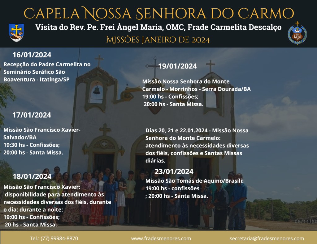O Rev. Pe. Frei Àngel Maria, chegará no Brasil no dia 16 de janeiro de 2024, fará uma visita ao Seminário Seráfico São Boaventura, em Itatinga/SP e depois partirá para as Missões no Nordeste e também em Brasília/DF.