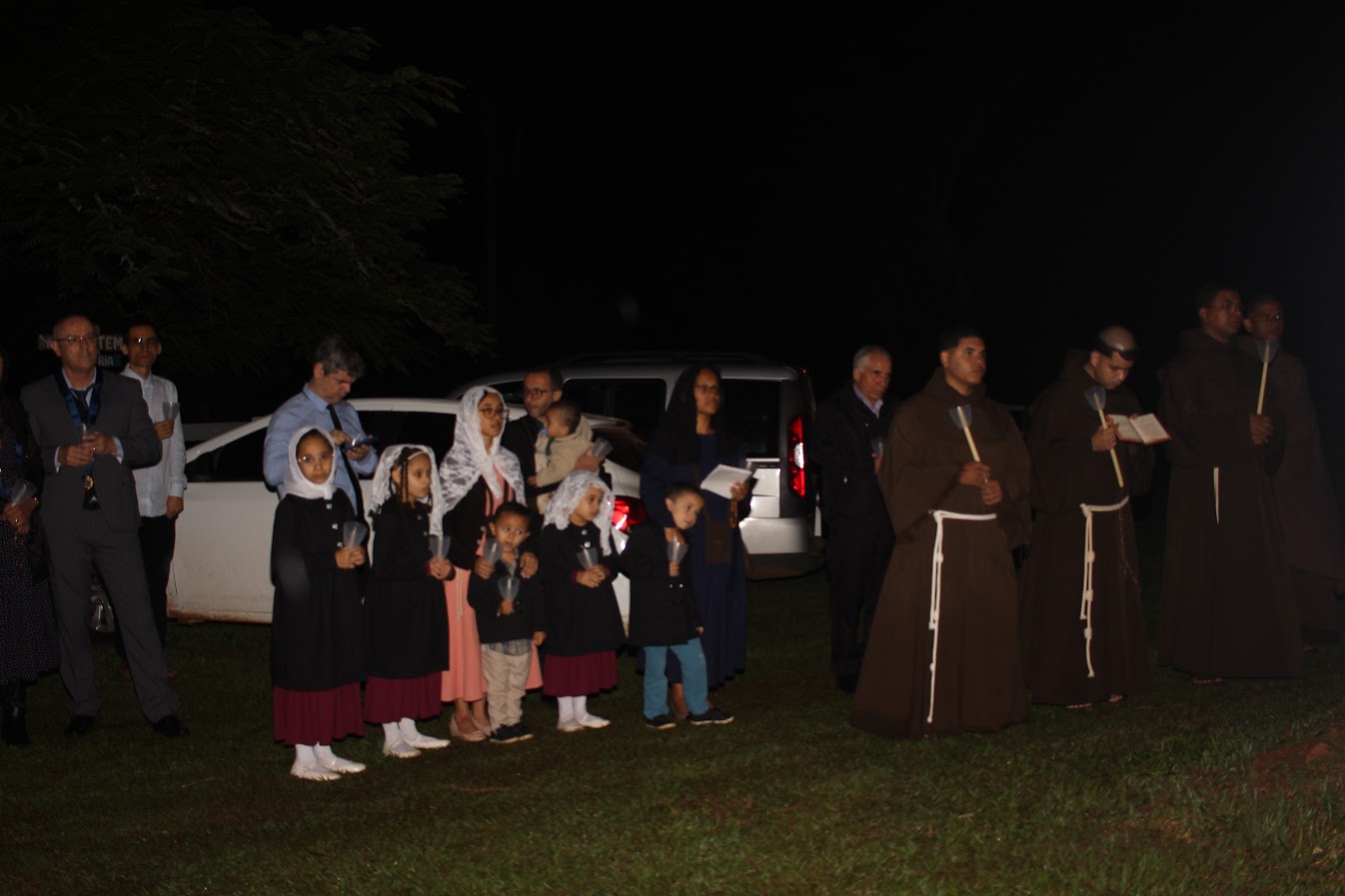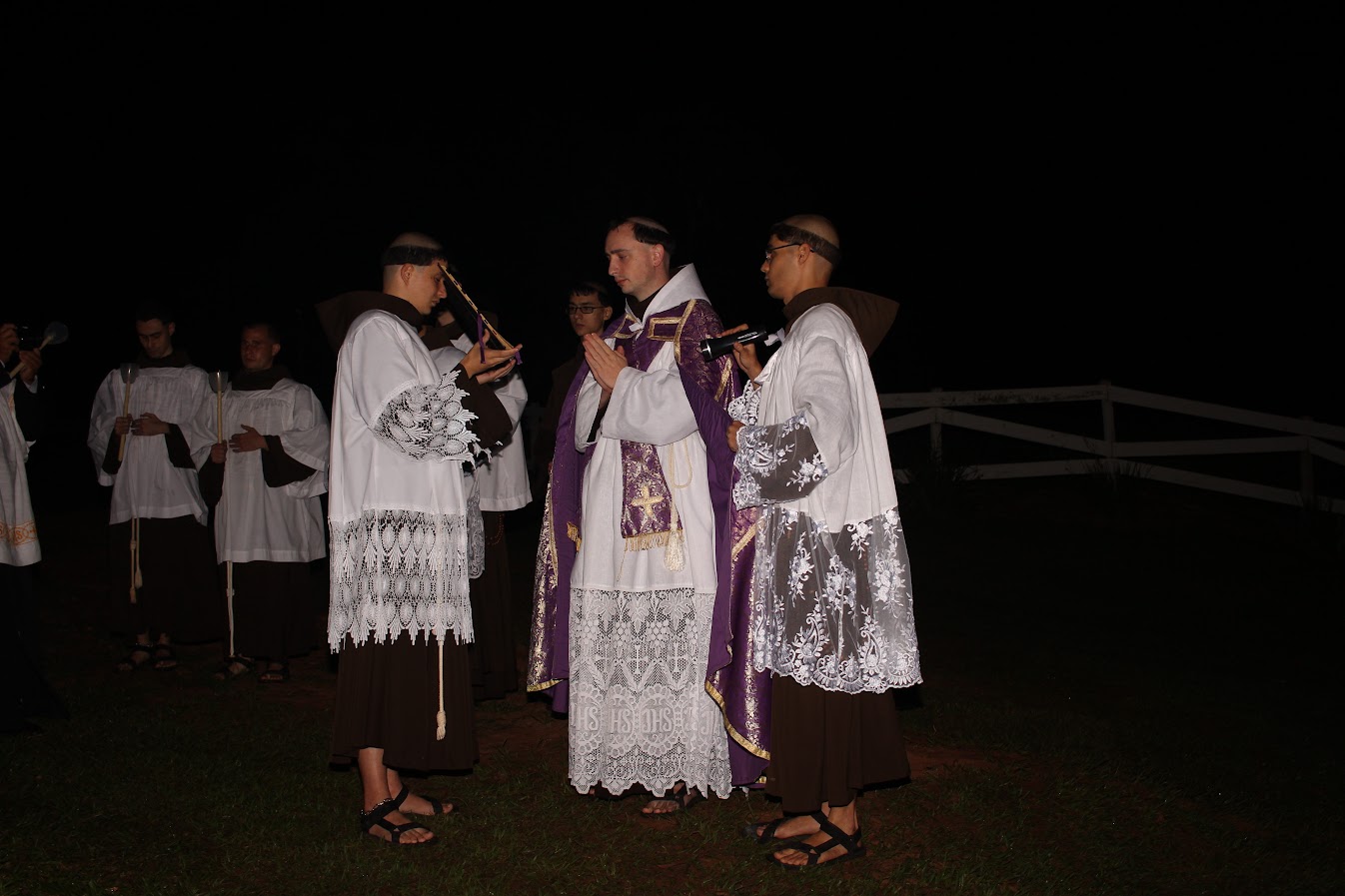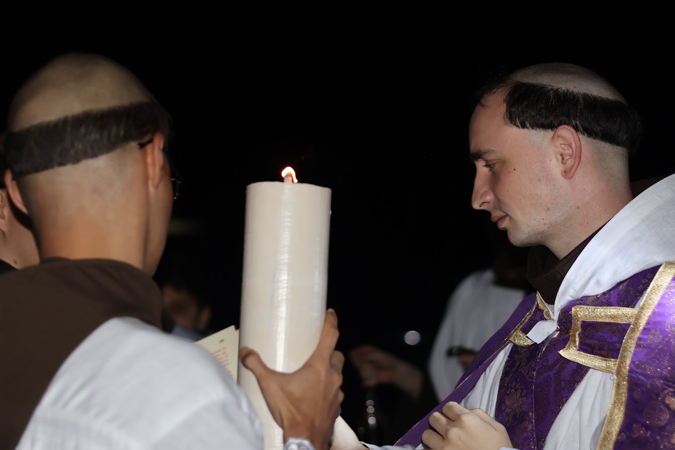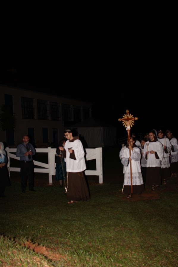 Em seguida, realizou-se a piedosa procissão rumo à Capela pública do Convento Seráfico, onde o celebrante, o Rev. Pe. Frei Boaventura de Nossa Senhora Sede da Sabedoria, entoou por três vezes o comovente e solene “Lumen Christi”, sendo cada vez respondido com fé e reverência por todo o povo: “Deo gratias”.