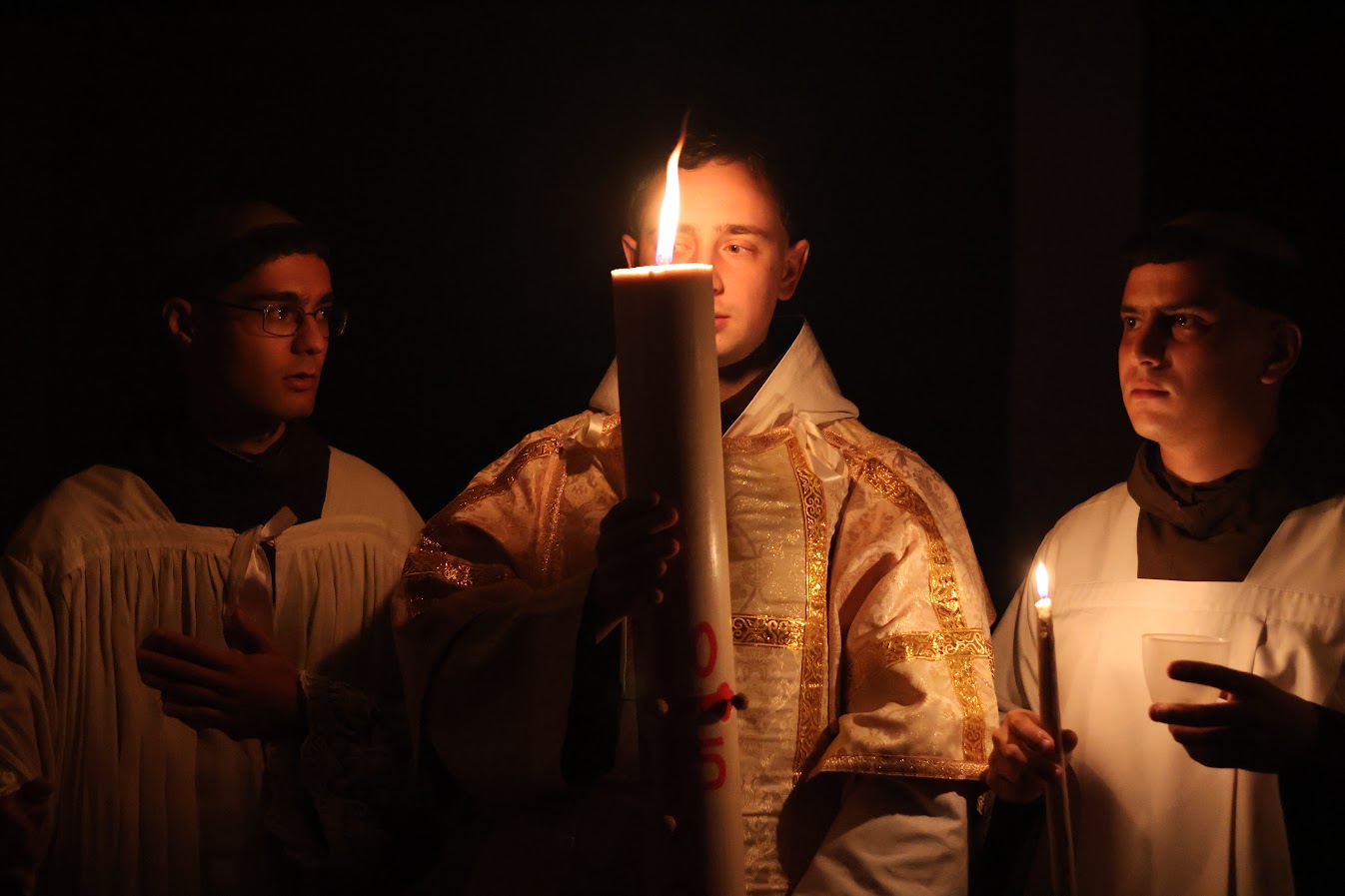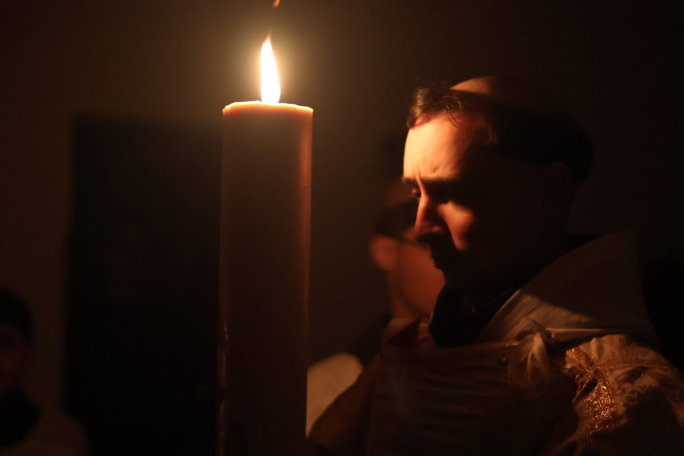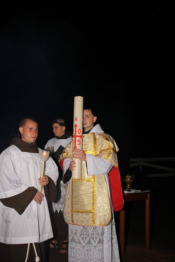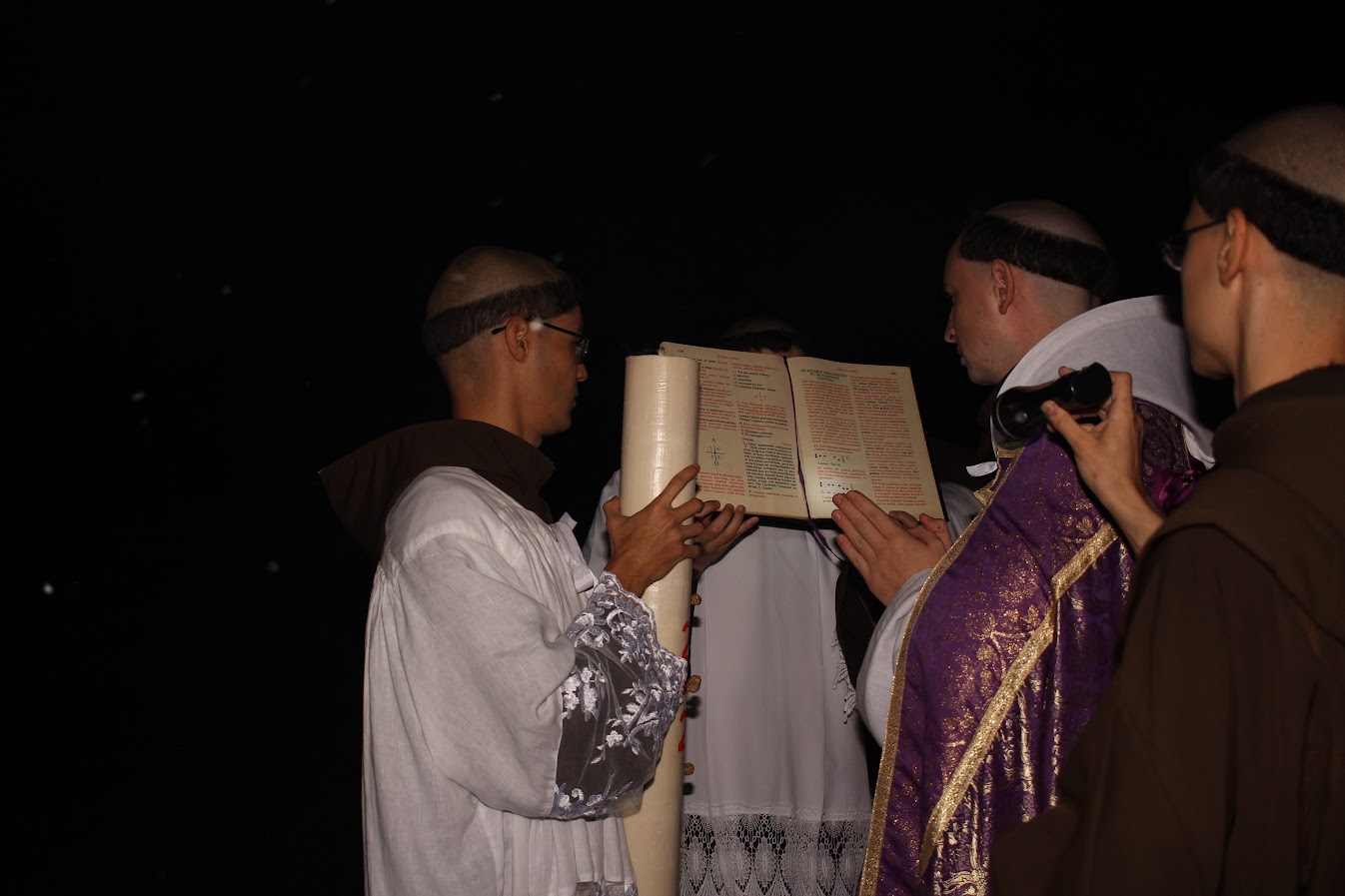 Caríssimos fiéis, com imensa alegria pascal, comunicamos que no último sábado, dia 19 de abril, pelas primeiras horas da manhã, foi cantado com piedade o último Ofício de Trevas deste Santo Tríduo. Já por volta das 23h, teve início, com toda solenidade litúrgica e devoção, a Augusta Vigília Pascal, com a tradicional bênção do fogo novo e do Círio Pascal.