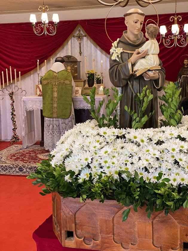 Tudo foi preparado com grande esmero por nossos religiosos. O altar e o andor com a imagem de Santo Antônio — recentemente doada por uma generosa família — foram ricamente ornados com flores, expressando a devoção e o carinho com que nossa comunidade aguardava este dia tão especial.