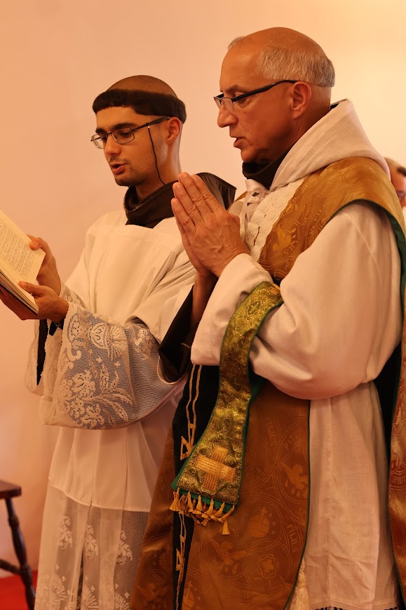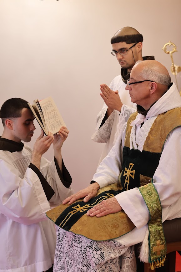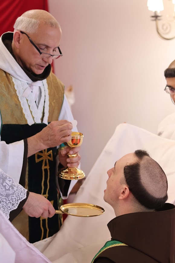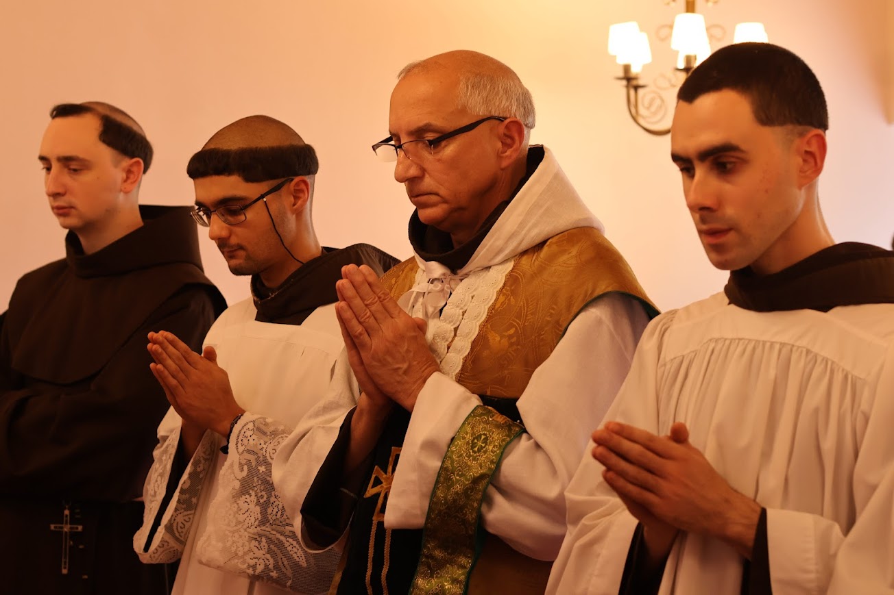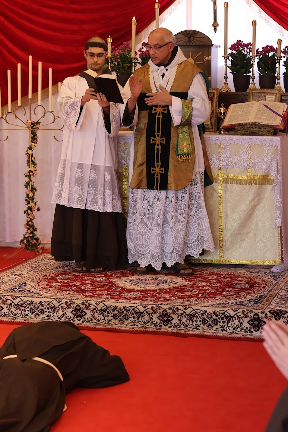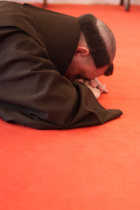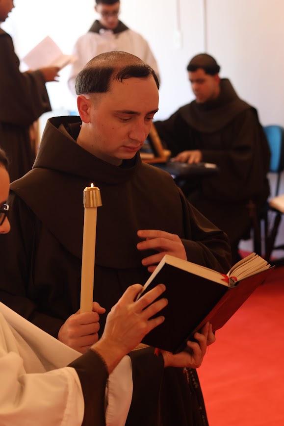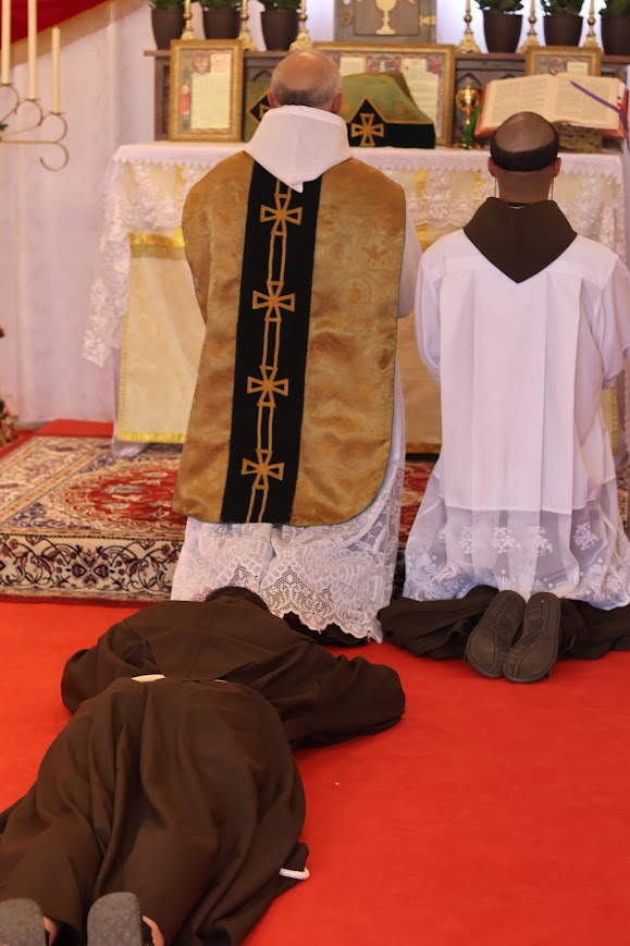 O professando, Frei Boaventura, prostrou-se por terra enquanto se entoava a Ladainha de Todos os Santos, implorando a intercessão celeste. Em seguida, foi cantado o Veni Creator Spiritus, pedindo a luz e a graça do Divino Espírito Santo para esse momento de consagração total.
