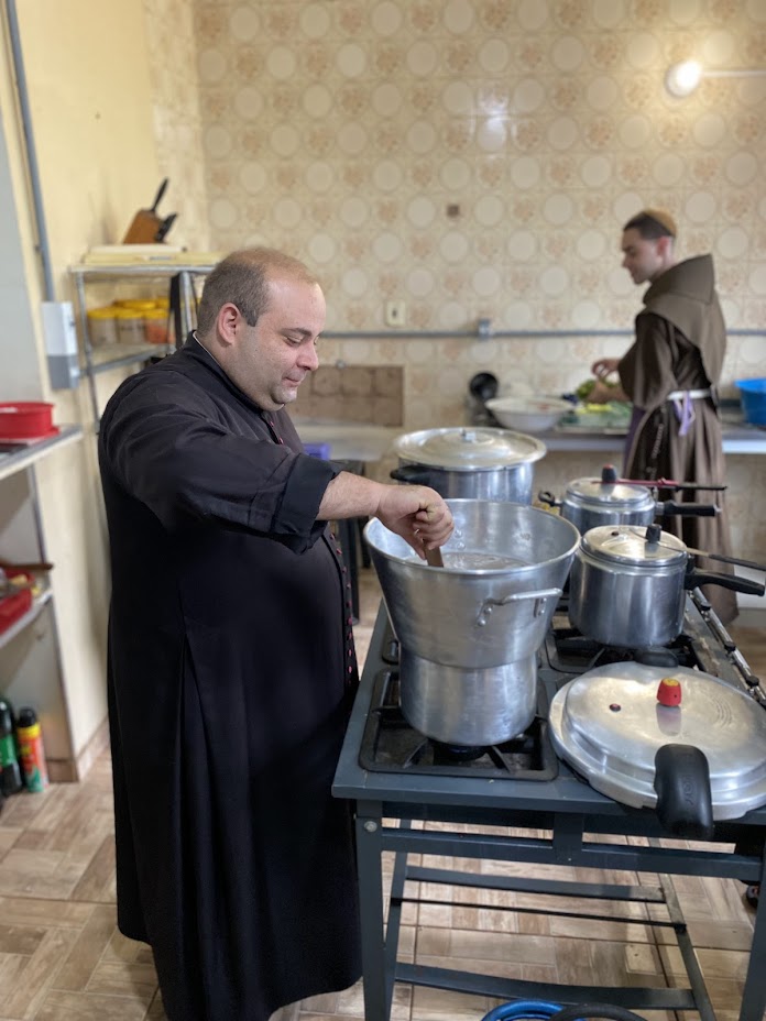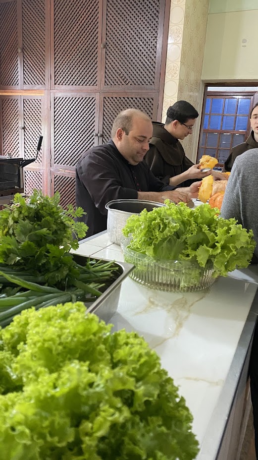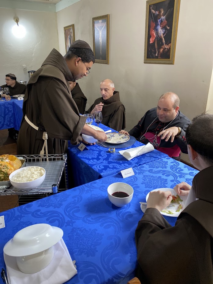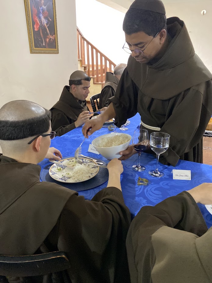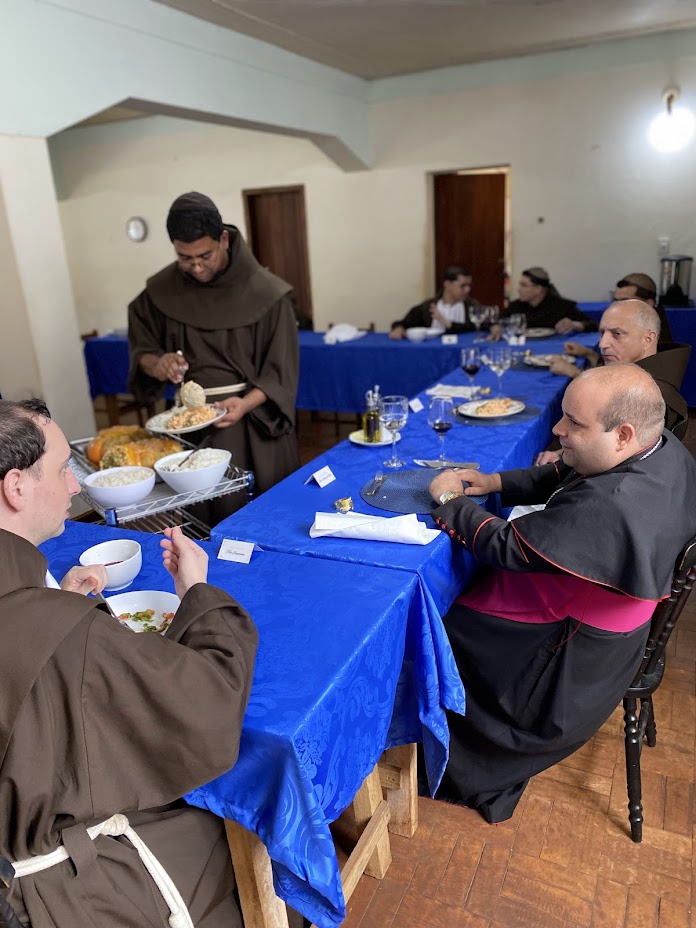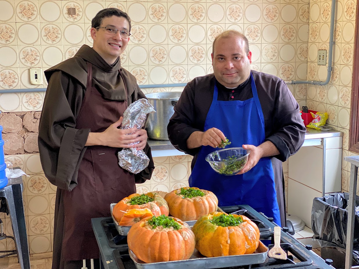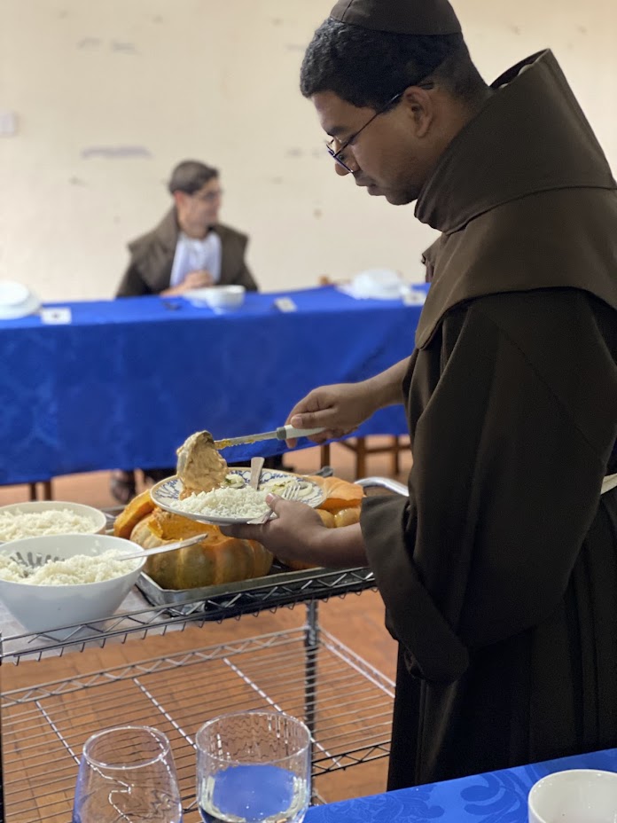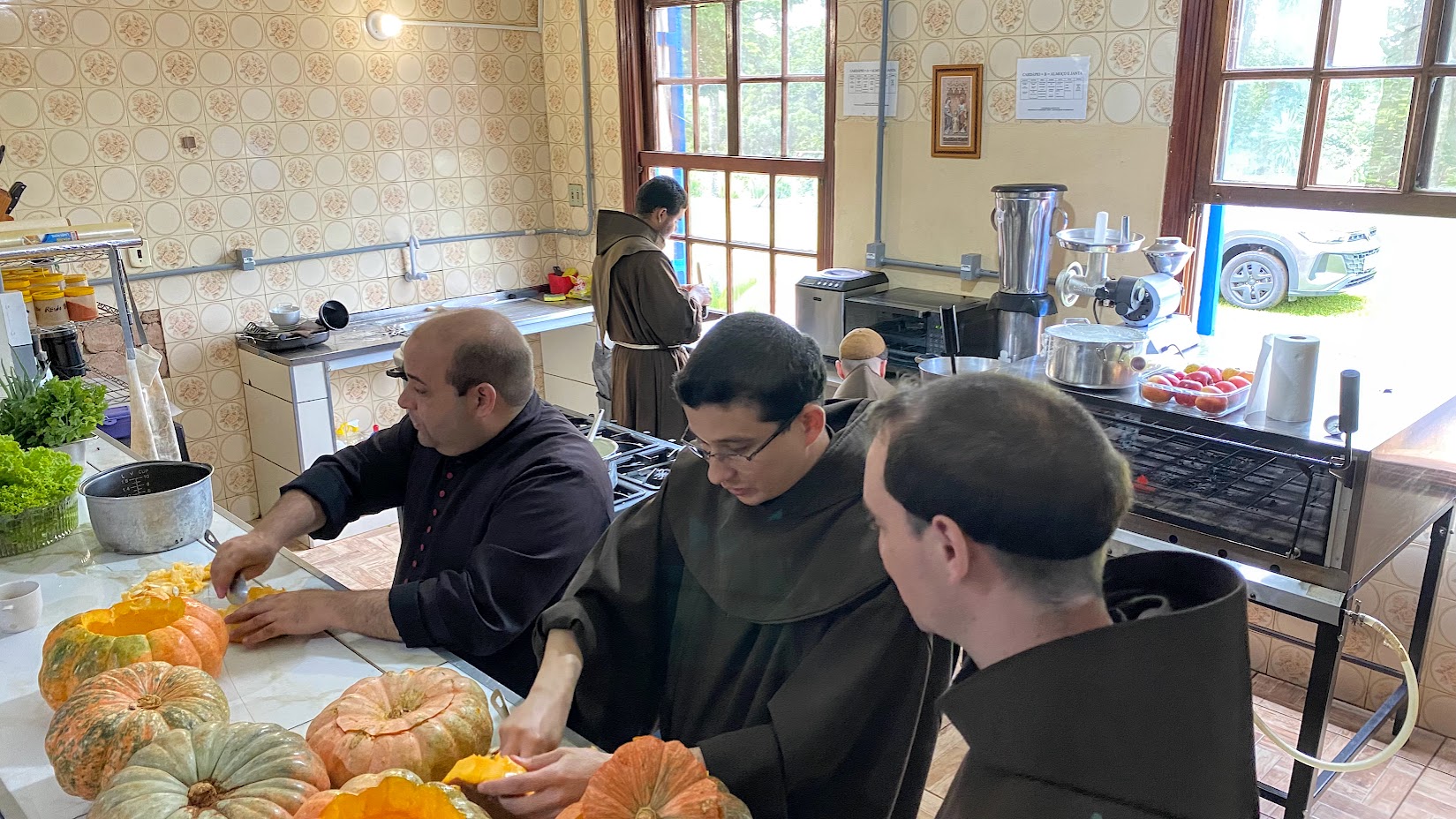 Com tudo devidamente preparado, o Senhor Bispo, auxiliado por nosso caríssimo Vigário Conventual, o Reverendo Frei João Maria Vianney, bem como pelos dedicados Irmãos Frei Félix e Frei Conrado, dedicou-se com simplicidade e alegria ao preparo do almoço da comunidade. O resultado foi um prato saboroso, preparado com cuidado e dedicação.
